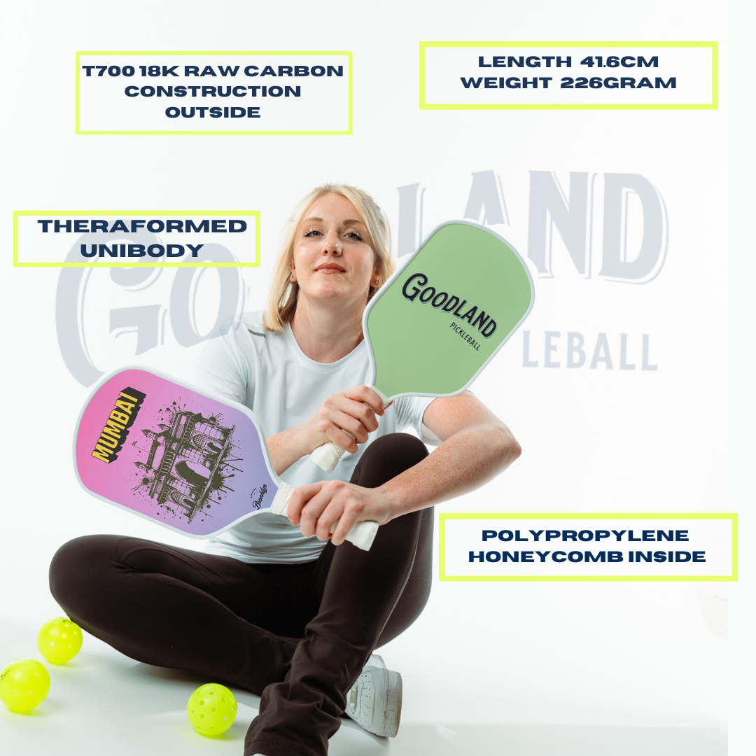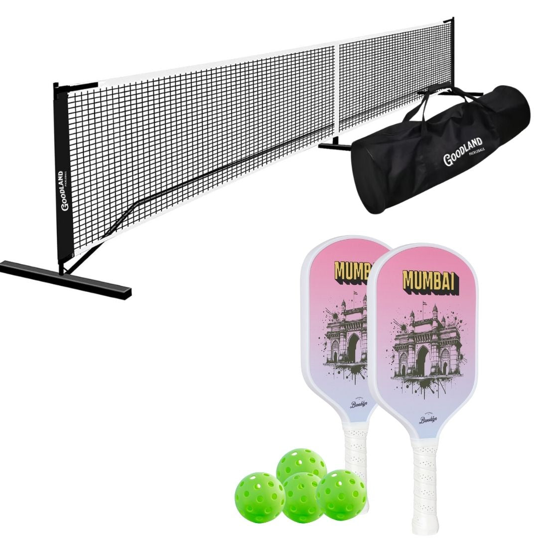 Experience the vibrant energy of Mumbai on the pickleball court with our premium Mumbai-themed pickleball paddle play kit. This kit includes two high-quality paddles, four balls, and a pickleball net, providing everything you need for a complete game. The paddles are crafted with T700 18k Raw Carbon and an material face, offering exceptional performance and durability. The PP Honeycomb Core ensures excellent control and power in every shot while maintaining a lightweight feel, perfect for swift, powerful swings. Embrace the lively spirit of Mumbai with uniquely designed paddles that stand out on the court. Built with high-quality T700 18k Raw Carbon for enhanced durability and performance, they also feature a robust and responsive surface for improved shot accuracy. Meeting USAPA standards, these paddles are suitable for official tournaments and competitive play. With a length of 41.6 cm and a weight of 226+/-5 g, each paddle offers a balanced and comfortable feel for extended play. The included pickleball net completes the set, making this kit ideal for both competitive players and enthusiasts looking to elevate their game with a touch of unique style inspired by the bustling city of Mumbai.